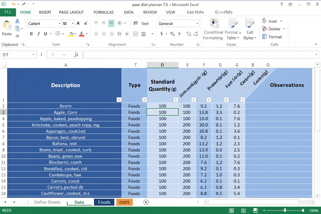 Já possui na planilha uma lista de alimentos de todos os grupos alimentares, baseada na Tabela Brasileira de Composição de Alimentos, basta escolher uma dieta de acordo com o seu gosto;