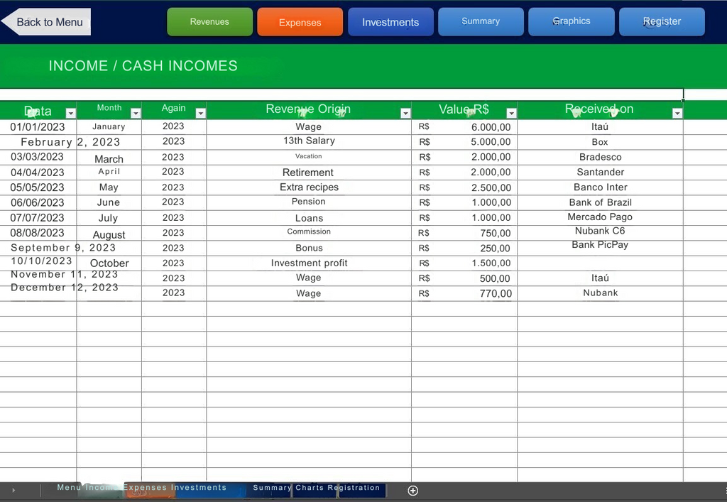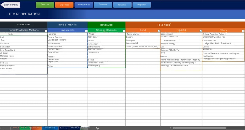 * Você digita seus itens na aba CADASTRO e eles aparecem automaticamente nas abas de Receitas, Despesas e Investimentos para usar e incluir os valores.