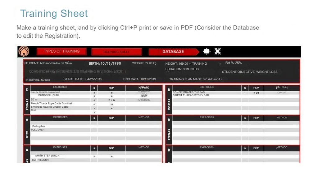 O Sistema contém Dados do Aluno, Avaliação Física, Área de Impressão, Cálculos Metabólicos (Entregue ao nutricionista do aluno), Controle dos Treinos com resumos em Dashboard.