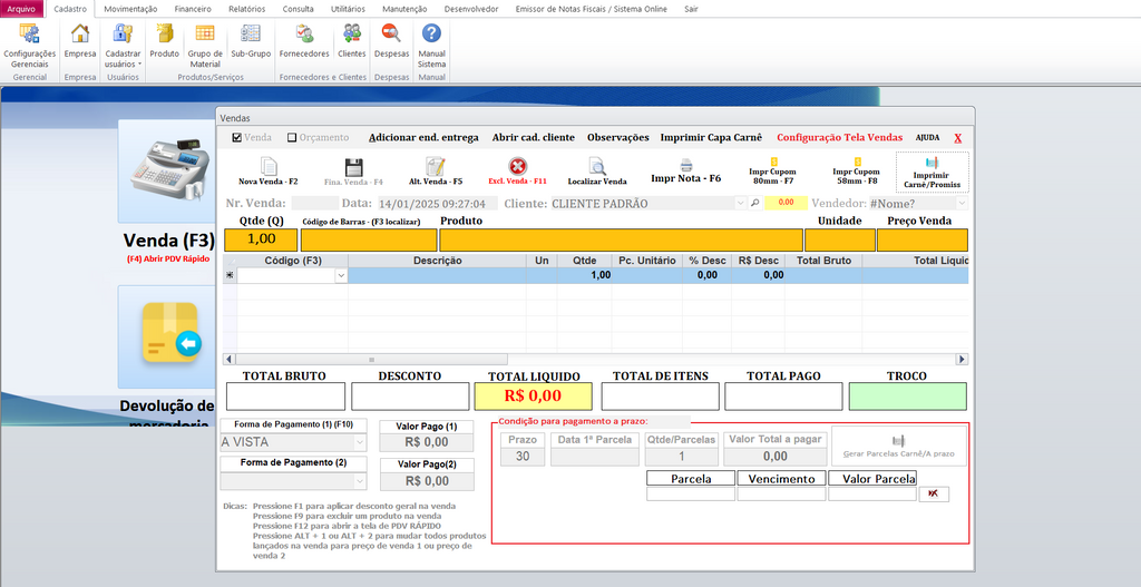 Vendas Simplificadas: Controle suas vendas por forma de pagamento, cadastrando métodos personalizados com taxas e outras informações. Inclui sistema de carnê com limite de compras por cliente, relatórios gerenciais e muito mais.