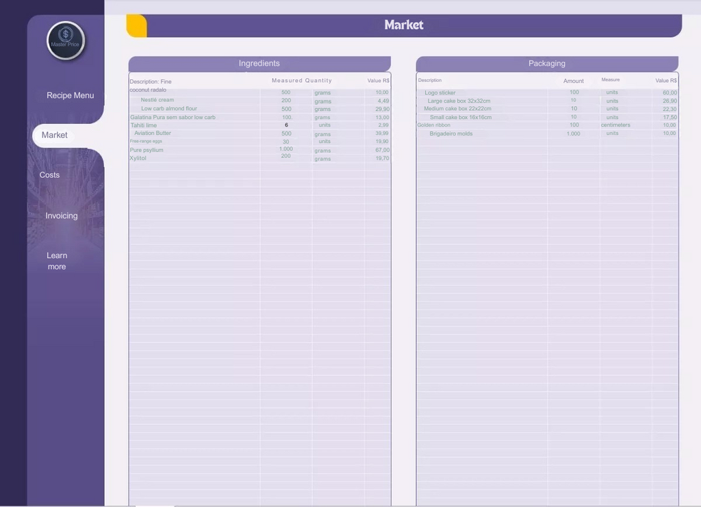 The Market Section automatically organizes ingredients and packaging in alphabetical order, making it much easier to find them when used in recipes;