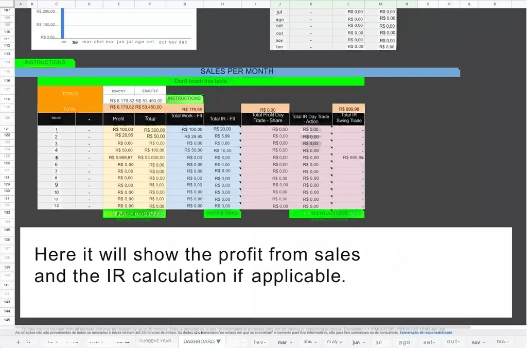 - will display the evolution of your assets, the division of assets by percentage and with a graph, will show the monthly total of deposits, income (JCP, dividends and income from FIIs), will show your sales month by month and whether or not you should pay any DARF in any month. MONTHS (Jan to Dec)